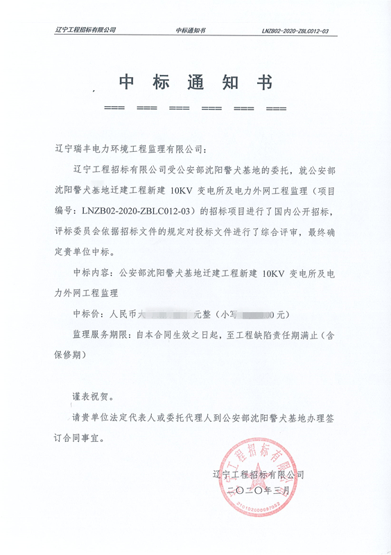 中標喜訊-公安部沈陽警犬基地遷建工程新建10kV變電所及電力外網(wǎng)工程監(jiān)理