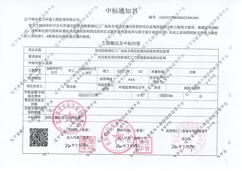 中標(biāo)喜訊-原沈陽新城化工地塊及周邊區(qū)域風(fēng)險(xiǎn)管控項(xiàng)目監(jiān)理