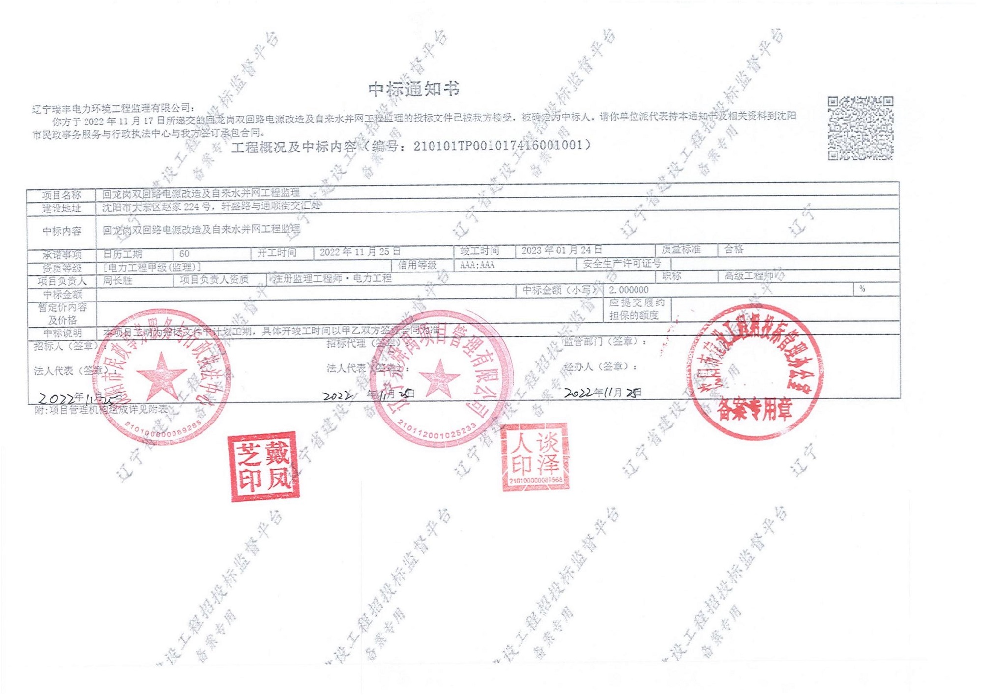 中標(biāo)喜訊-回龍崗雙回路電源改造及自來(lái)水并網(wǎng)工程監(jiān)理