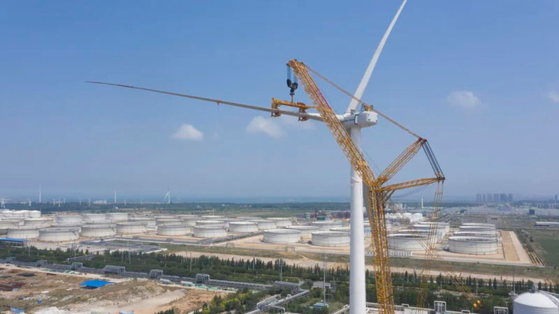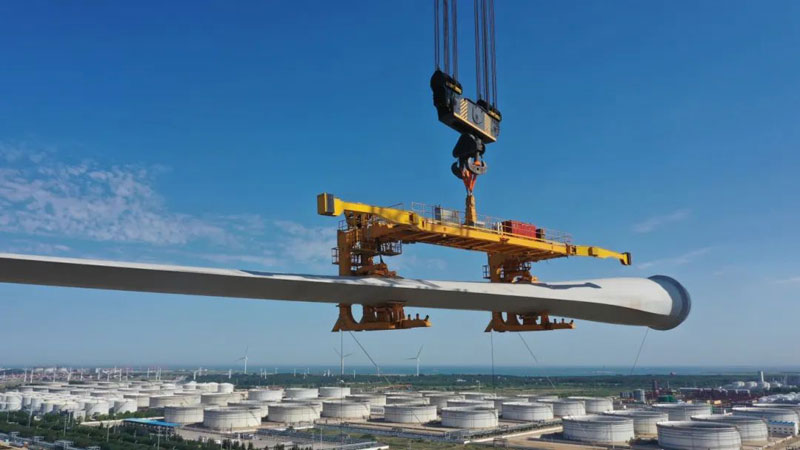 針對(duì)風(fēng)電部件的龐大和脆弱性,項(xiàng)目團(tuán)隊(duì)經(jīng)過反復(fù)討論,不斷優(yōu)化施工工藝和流程,啟用4000噸級(jí)履帶式起重機(jī)全球首次塔式工況進(jìn)行主吊,多臺(tái)副吊協(xié)同,通過水平單葉片吊裝方案和超高工況下互補(bǔ)模式進(jìn)行吊裝,避免了吊裝過程中的損傷風(fēng)險(xiǎn),保障安全的同時(shí)提高施工效率。