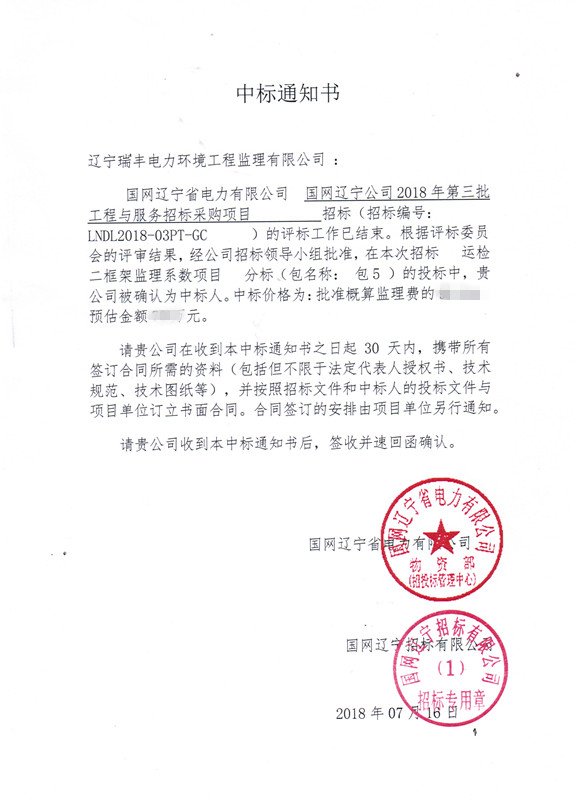 中標(biāo)喜訊-國網(wǎng)遼寧公司2018年第三批工程與服務(wù)-運檢二框架監(jiān)理